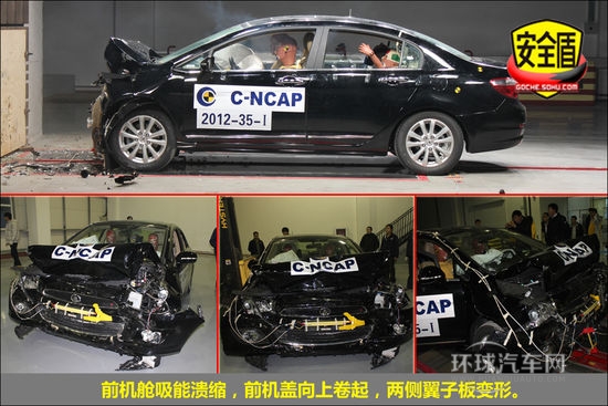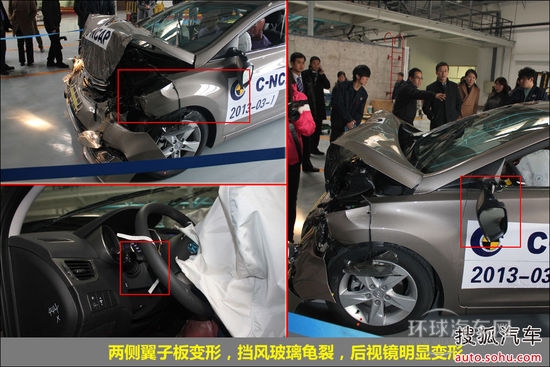 首先讓我們從C-NCAP所進行的正面100%碰撞測試開始分析。寶駿630前機艙因吸收了大部分碰撞能量而潰縮變形,A柱一處稍有變形,4門可正常開啟。