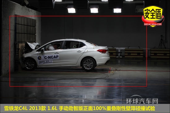 雪特龍C4L在正面碰撞中獲得15.30的得分,得分率為85.00%,總體表現不錯。前機艙因吸收了大部分碰撞能量而潰縮變形,4門可正常開啟。