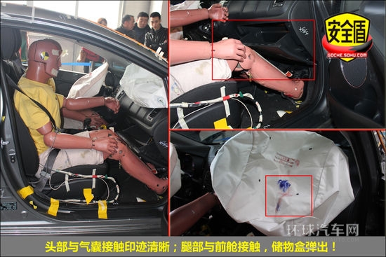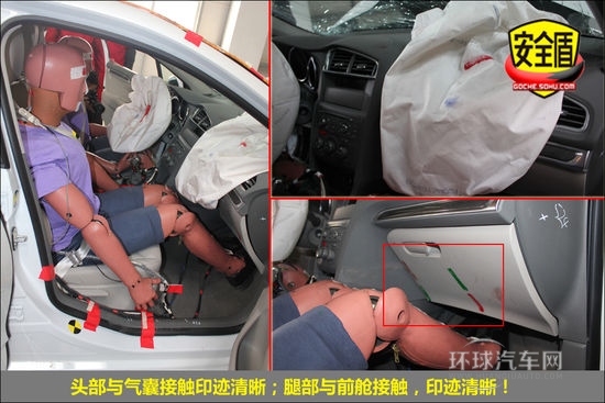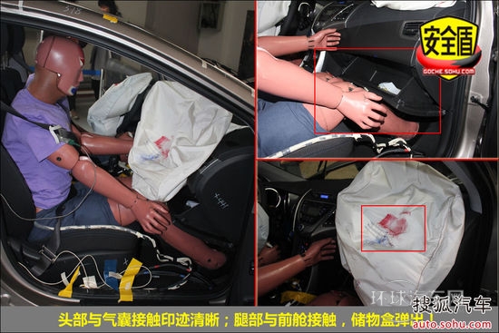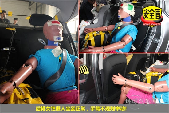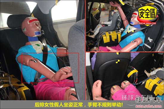 前排氣囊正常彈出,副駕駛席假人腿部與前艙接觸,痕跡明顯;后排假人坐姿正常,頭部與車頂接觸,痕跡明顯,兒童假人運動幅度較大,手腳有不規則舉動!不足之處在后排假人胸部受傷較重,這需要進一步改進。