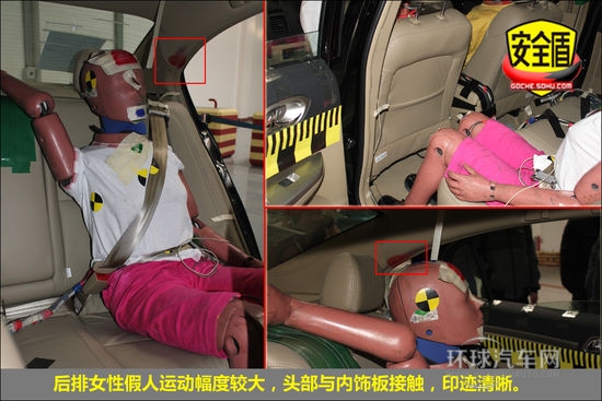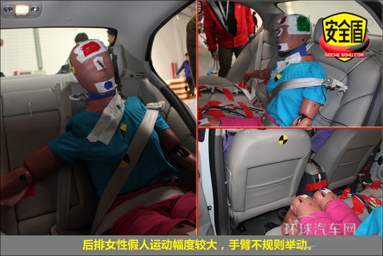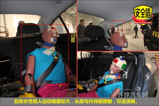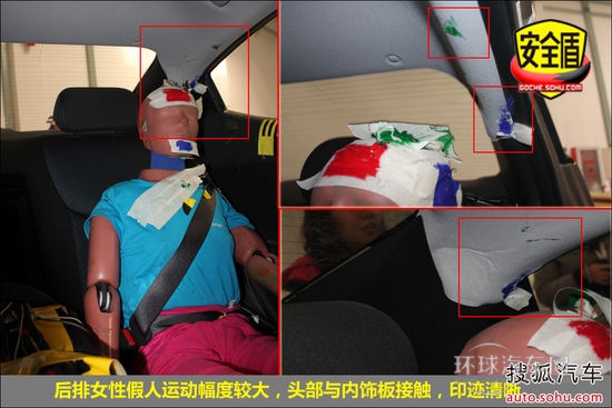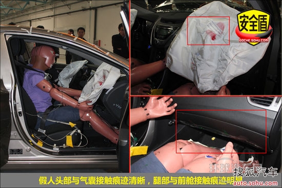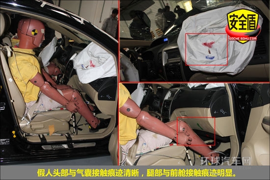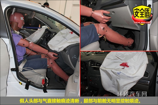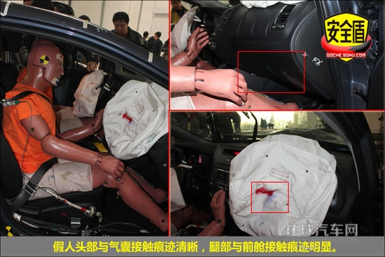 碰撞后,前排氣囊正常起爆,駕駛席假人向左微傾,安全帶緊勒假人身上,駕駛席假人頭部與氣囊接觸印跡清晰,假人腿部與前艙明顯接觸痕跡;副駕駛席假人向左微傾,安全帶緊扣假人身上,腿部與前艙接觸痕跡明顯,頭部與氣囊接觸印跡清晰。