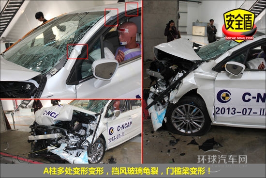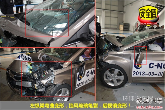 長安逸動碰撞后上頂梁、車頂?shù)壬杂凶冃危瑩躏L(fēng)玻璃完好,車窗玻璃完好,左側(cè)車門能正常開啟,顯示出高強(qiáng)度車身的優(yōu)勢。車廂對試驗(yàn)假人的保護(hù)也很到位,假人坐姿正常,且安全帶緊扣假人身上,側(cè)面安全氣囊及氣簾在碰撞瞬間均正常展開,為假人的胸部和頭部提供了更優(yōu)秀的安全保障。逸動得分13.04分,得分率為72.44%。