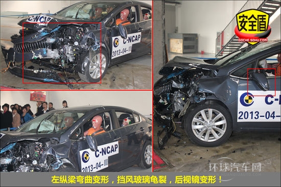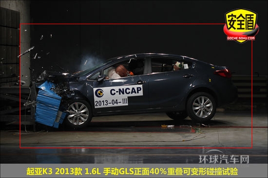 起亞K3在40%正面偏置碰撞測試中,獲得了15.28分,得分率84.89%。起亞K3碰撞后,整車向右后方成一定弧度倒退,引擎艙吸收、分散了大部分沖擊力導(dǎo)致嚴(yán)重變形,幾乎縮進(jìn)一大半,大部分配件散落一地;左前大燈破碎,前包圍斷裂脫落,左側(cè)翼子板潰縮變形,前防撞鋼梁嚴(yán)重扭曲變形,左縱梁彎曲變形;擋風(fēng)玻璃龜裂;A、B、C柱無明顯變形,其他車門可正常開啟,方便了乘員自行打開車門迅速逃生。