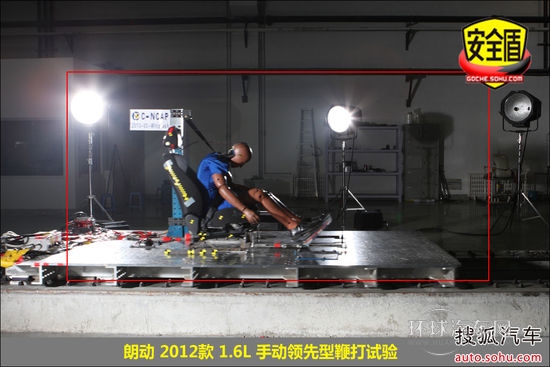 鞭打試驗是指將試驗車輛駕駛員側座椅及約束系統仿照原車結構,固定安裝在移動滑車上,滑車以速度變化量為15.65km/h(正負0.8km/h內)的特定加速度波形發射,模擬后碰撞過程。座椅上放置BioRID II型假人,通過測量后碰撞過程中頸部受到的傷害情況,用以評價車輛座椅頭枕對乘員頸部的保護效果。