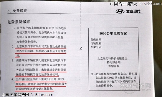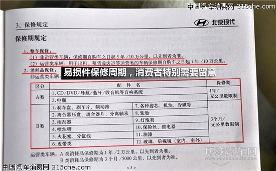 從上圖可以看出,索納塔八也只是對發動機、變速箱等核心不及實行5年或10萬公里的質保,但是對CD、導航、藍牙、收音機以及電瓶只實行1年的質保,對雨刮器、剎車盤、輪胎以及皮帶等只實行3個月的質保,相比前面的速銳質保周期還要短,這讓人有些不爽。
