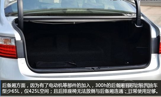 300h車廂內的空間與350完全相同;后車門上沒有任何儲物空間給日常使用帶來不便;后備廂空間方面,因為有了電動機等部件的加入,300h的后備廂容積比ES系列的純汽油車型(ES250和ES350)少65L,僅425L空間。