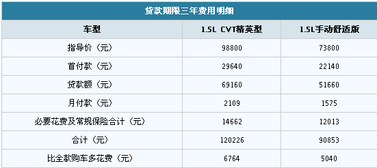 首先我們來看看全款購車需要多少費用。以上文推薦的1.5L CVT精英型和1.5L手動舒適版為例,購車費用明細如下: