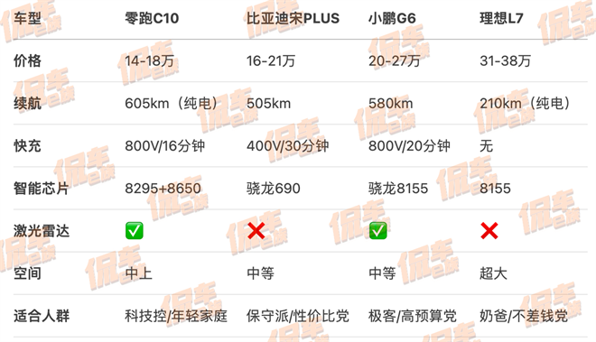 首先,零跑C10的定位很明確:14萬(wàn)級(jí)純電/增程雙動(dòng)力SUV。純電版起售價(jià)預(yù)計(jì)14萬(wàn)左右(對(duì)標(biāo)比亞迪元PLUS、深藍(lán)S7),頂配帶激光雷達(dá)的版本可能沖上18萬(wàn)(正面剛小鵬G6、極氪X)。增程版價(jià)格估計(jì)再低1-2萬(wàn),主打“可油可電焦慮退散”。橫向?qū)Ρ韧瑑r(jià)位競(jìng)品,這價(jià)格配上800V+605km續(xù)航+激光雷達(dá),屬實(shí)是“貼臉開(kāi)大”。