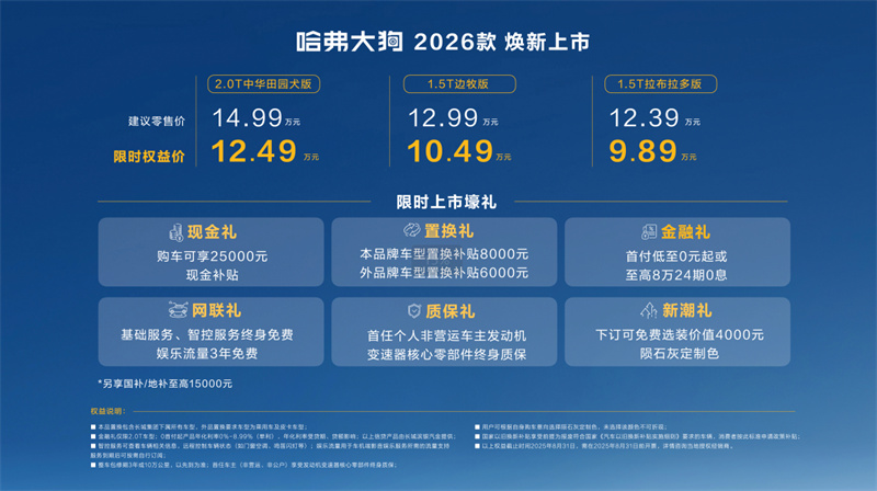 為了能讓更多熱愛探索、向往自由的年輕人輕松擁有屬于自己的“潮玩新旅伴”,哈弗特別推出限時購車福利。即日起下單哈弗大狗2026款即可享受6重限時上市壕禮。