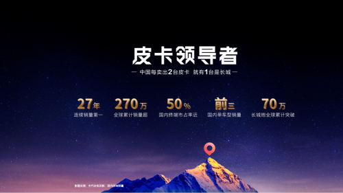 目前,長城皮卡已連續27年銷量第一,全球累計銷量超270萬輛,國內終端市占率近50%,中國每賣出兩臺皮卡,就有一臺是長城。長城炮、風駿、金剛炮長期包攬皮卡市場單車型銷量前三。長城炮誕生五年多,全球累計用戶突破70萬,蟬聯中國皮卡銷量冠軍,創造了新的“長城炮速度”。