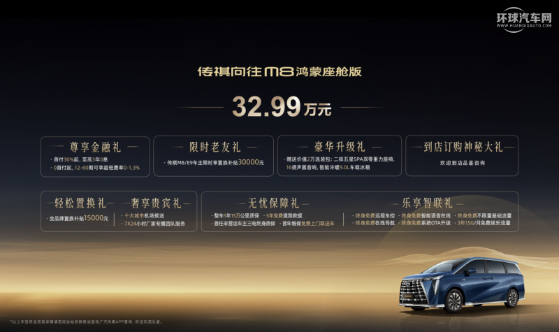 不到8年時間,廣汽傳祺的第80萬輛MPV都已經下線了,傳祺M8至今還在刷新中國豪華MPV單車型紀錄。同時,作為第80萬輛下線的傳祺MPV,并且也是傳祺M8家族第45萬輛量產下線的整車,傳祺向往M8鴻蒙座艙版首發上市,官方指導價32.99萬元。如果你是置換購車,那么恭喜你,傳祺給你補貼1.5萬。如果你是老M8/E9車主換購,那么你會收獲所有人都會羨慕,傳祺寵粉補貼翻倍,補貼后只需29.99萬即可入手。