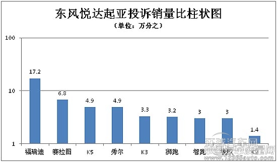 從以上圖表分布來看,東風(fēng)雪鐵龍世嘉、C5投訴銷量比遠(yuǎn)高于整體平均水平。其中,世嘉的數(shù)據(jù)更是超過平均數(shù)值的近5倍;而C2這款車的銷量也相對(duì)較大,但投訴銷量比還是處于較低水平,在雪鐵龍車型中整體表現(xiàn)Z好。東風(fēng)悅達(dá)起亞的福瑞迪投訴銷量比Z高,達(dá)到17.2/10000,超出整體平均數(shù)的1.8倍;賽拉圖的數(shù)據(jù)接近于平均值,除此以外各車型均低于平均水平,這樣的數(shù)據(jù)還是值得肯定。