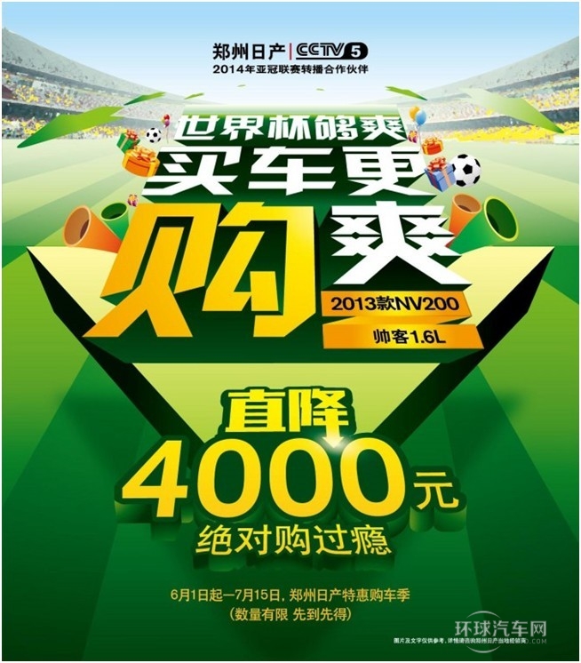 這個夏天,有世界杯和鄭州日產“特價風暴”就夠了!品質有保證、宜商又宜家、寬敞又時尚的鄭州日產CDV車型將給你的工作和生活帶來更多自由,“特價風暴”活動7月15日即止,如此優惠錯過不再有。一個人宅在家看球?不如抓緊時間下手一臺CDV,和伙伴們一起出來馳騁綠蔭,縱享世界杯之夏吧!