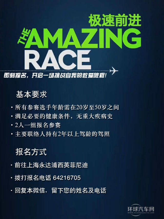 (2014年7月28日)英菲尼迪Q50《極速前進》預選賽招募即日起正式啟動,前往英菲尼迪上海經銷店永達浦西英菲尼迪或撥打報名電話6421 6705,即可報名參與。您也可以通過微信方式報名,報名方式:關注官方微信號Yongda_Infiniti_Puxi 回復姓名+手機號+活動名稱即可。