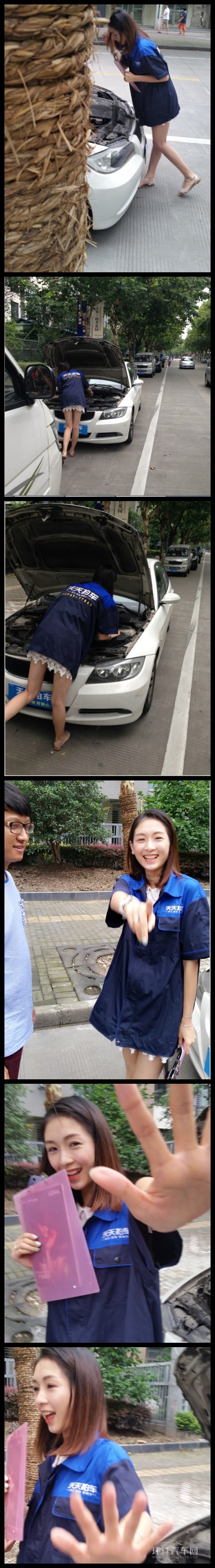 由于網絡照片上不經意的暴露了是某公司工作服,經過小編順藤摸瓜,終于了解到這組照片的女主角是就職于天天拍車二手車網絡競賣服務平臺的方萍(化名)。作為檢測師的她主要負責檢測二手車輛的各項指標。這組照片記錄下了她在平時工作中的真實情況。