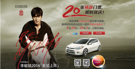 我們相信,東風(fēng)悅達(dá)起亞立足文化營(yíng)銷(xiāo),將持續(xù)為消費(fèi)者打造Z激動(dòng)人心的品牌體驗(yàn)。李敏鎬2014“重裝上陣”世界巡演即將火熱登場(chǎng),東風(fēng)悅達(dá)起亞也將為歌迷與消費(fèi)者們帶來(lái)提供更多與偶像親密接觸的難得機(jī)會(huì)。