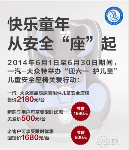 2014年5月30日,一汽-大眾汽車有限公司正式宣布,自2014年6月1日至6月30日期間,一汽-大眾大眾品牌隆重推出‘迎六一護兒童’關愛行動。凡在一汽-大眾特許經銷商處購買新車的用戶,可享受500元的關愛價購買一套市場指導價為2180元的高品質兒童安全座椅。活動期間,一汽-大眾大眾品牌的保有用戶可按照1680元/套的回饋價進行購買,所有的其他客戶也可用2180元/套的價格享受到一汽-大眾原裝附件兒童安全座椅帶來的安全汽車生活。
