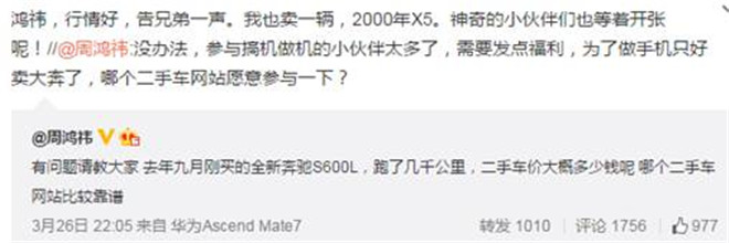 二手車網站很開心,這是個大顯身手的好機會。車易拍、人人車、平安好車等二手車在線交易領域的玩家開始紛紛勾搭老周在自己平臺賣車。有些直接給出了高于市場價的高價,擺明要“利誘”,還有的把前臺妹子推出來開啟“美人攻勢”。車易拍更是通過官方微博喊出“老周、元慶,約嗎”,稱如果得到兩位大佬的回應,將在360“AK47”和神奇手機上市之日第一時間送給大家。
