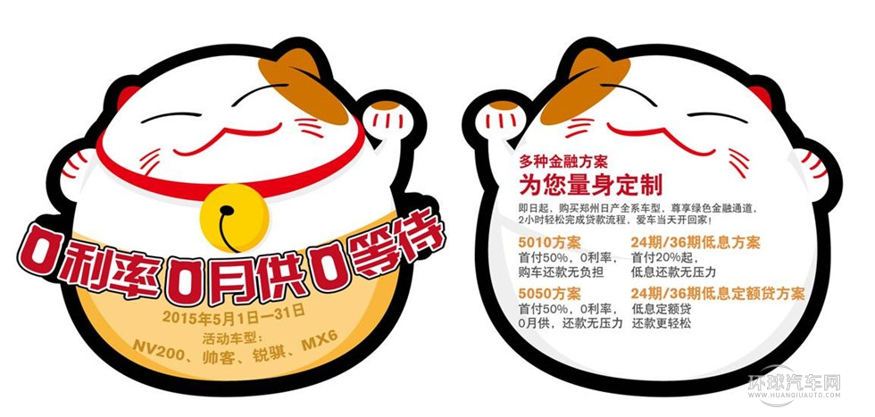 2015年5月1日至31日期間,進入全國鄭州日產(chǎn)專營店購買東風風度MX6、帥客、NISSAN NV200、銳騏皮卡四款明星車型中任意一款,即享“5050”和“5010”等半價提車優(yōu)惠政策,消費者只需首付50%,便可享受“0利率”分期購車,剩余費用可選擇一年后一次性付清或一年內分12期還清。