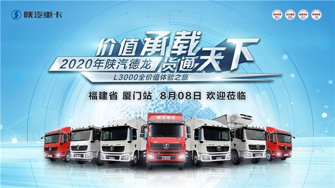 為答謝新老顧客的支持,陜汽德龍廈門德贏汽車銷售有限公司將于8月8日在廈門同安工業集中區-同安閩南農副產品物流中心-324國道三個地點開展“價值承載、貨通天下”為主題的德龍L3000全價值體驗之旅活動,期間特推出多重購車優惠、超低價格、超多優惠、超多政策,現誠邀各位新老客戶撥冗蒞臨!