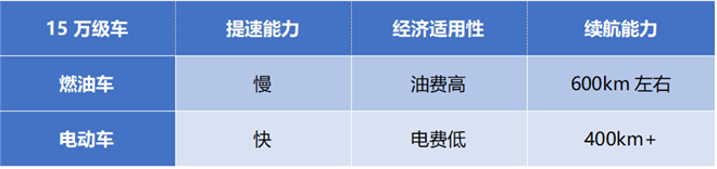 通過對核心需求的分析,很多車主反映電動車能解決號牌的燃眉之急、更經濟適用、提速快、靜音好……燃油車or純電動車的答案一目了然。然而一線城市的車主還是或多或少存在著“里程焦慮”,表示400km續(xù)航是基本門檻。接下來便是尋找“15萬級純電動車的最優(yōu)解”。