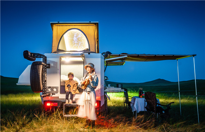 旅裝炮采用全鋁合金后廂體,車頂可加裝太陽能電池板,箱體內部配備逆變器儲備電池,解決了戶外生活的用電問題。選擇一塊視野開闊的地方停車,打開駐車熱水器洗個熱水澡,躺在1.9m*1.8m的超大雙人床上,升起車頂帳篷,和家人一起仰望星空,既浪漫又溫馨。