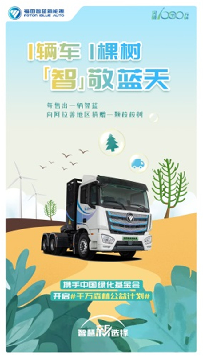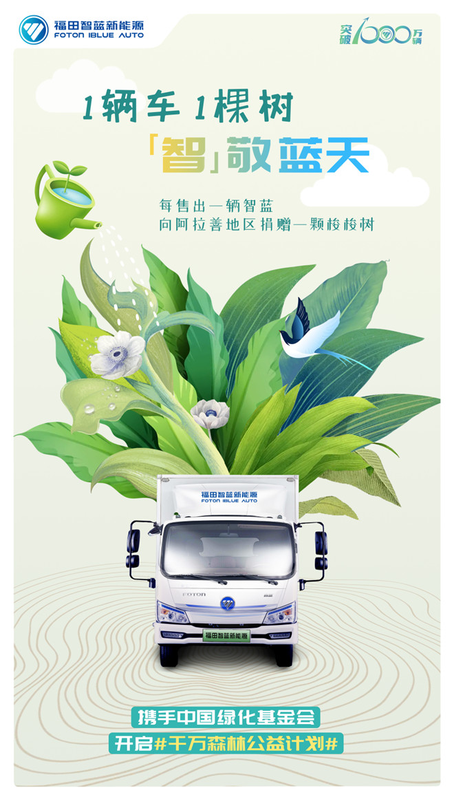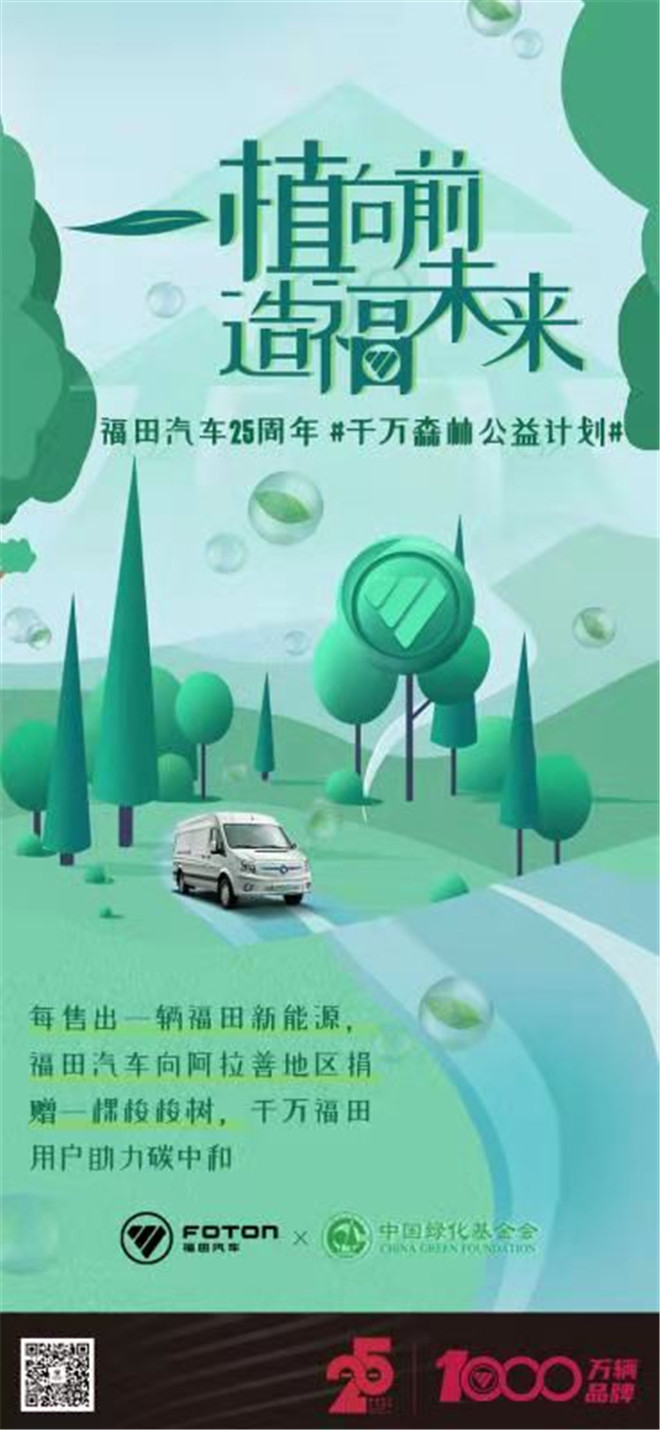 身處新能源行業(yè),扛起節(jié)能降碳的大旗,值福田汽車25周年啟動(dòng)下一個(gè)千萬輛目標(biāo)之際,福田智藍(lán)新能源發(fā)起“千萬森林”公益計(jì)劃,攜手中國綠化基金會(huì)公益植樹。