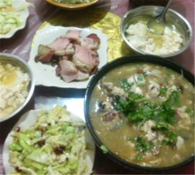 這里吃食最有名的就是農家豆花飯、一雞三吃和跑山豬制成的臘肉香腸。豆花飯非常獨特,豆花的軟嫩撞上香甜大白飯,一口下去,舌尖都在打顫。跑山豬烤肉值得一試,鮮香一絕,用它配飯,我能直接干三碗米飯。