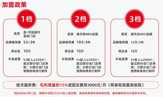 值得一提的是,天貓養車總部還將承擔不大于200平方的VI形象投入,SI部分由門店按照標準自行制作。
