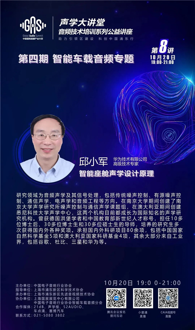《2022GAS聲學大講堂——音頻技術培訓系列公益講座》第四期智能車載音頻專題第八講將于10月20日19點開講,本次邀請了華為技術有限公司高級技術專家邱小軍,講座主題:《智能座艙聲學設計原理》。由中音協智能車載音頻分會會長、蘇州上聲電子股份有限公司高級技術專家柴國強擔任特邀主持人,觀眾互動環節主持人將收集不同平臺的觀眾問題與演講嘉賓問答互動。