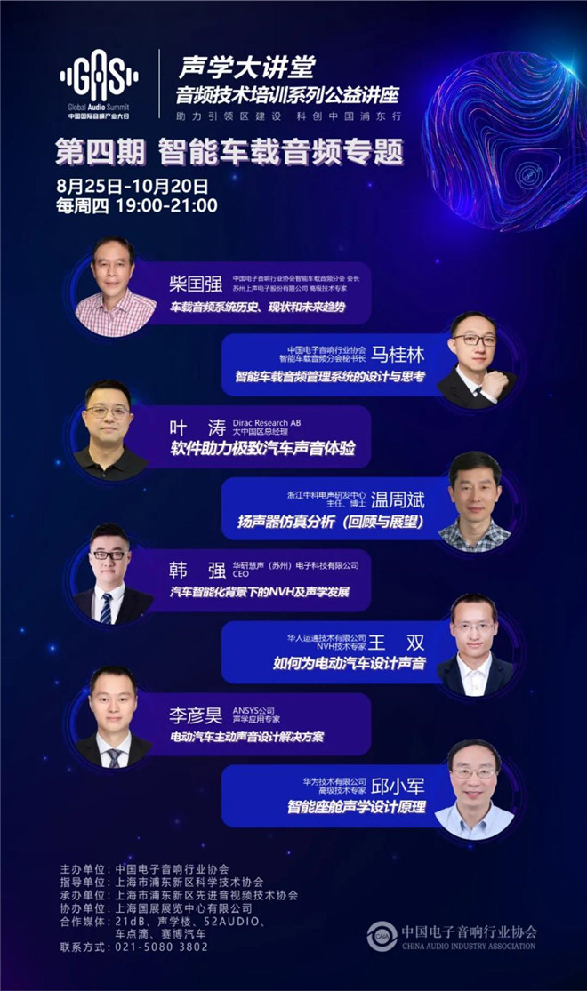 8月25日至10月20日,每周四19:00-21:00,聲學大講堂將持續為大家分享關于智能車載音頻方面的知識,詳細議題與演講嘉賓信息如下,敬請關注。