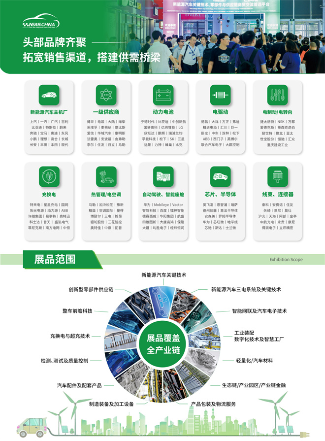 NEAS CHINA 一直致力于全品類展商布局,展品精準(zhǔn)覆蓋新能源汽車(chē)全產(chǎn)業(yè)鏈,為“汽車(chē)人”構(gòu)建行業(yè)生態(tài)圈,高效促進(jìn)商貿(mào)交易與技術(shù)交流,為展商和觀眾提供無(wú)限商機(jī)!