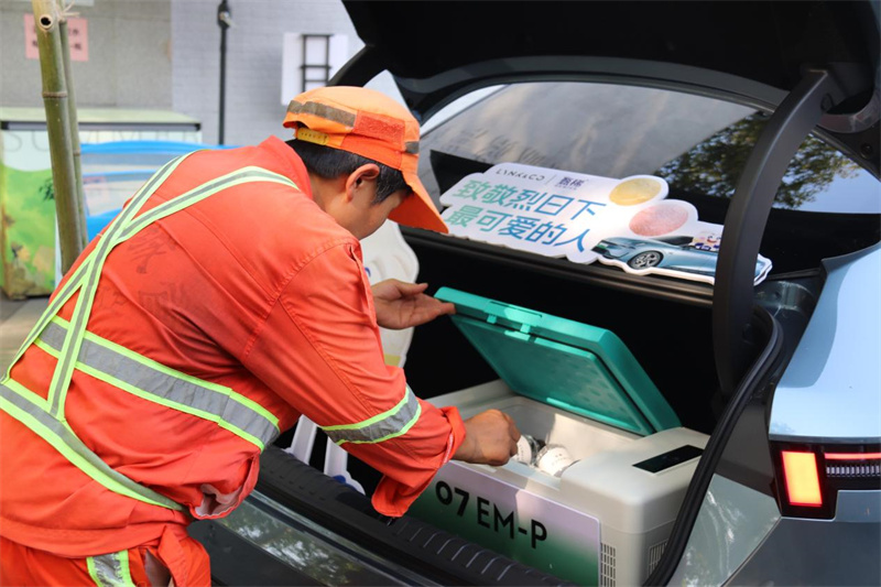 8月14日,領(lǐng)克品牌在西湖邊清波街道設(shè)置愛心冰箱,為環(huán)衛(wèi)工人、綠化工人、城管執(zhí)法隊員、交警執(zhí)勤人員、快遞小哥等戶外一線勞動者,免費派送冰淇淋,幫助他們在炎炎夏日獲得絲絲清涼。