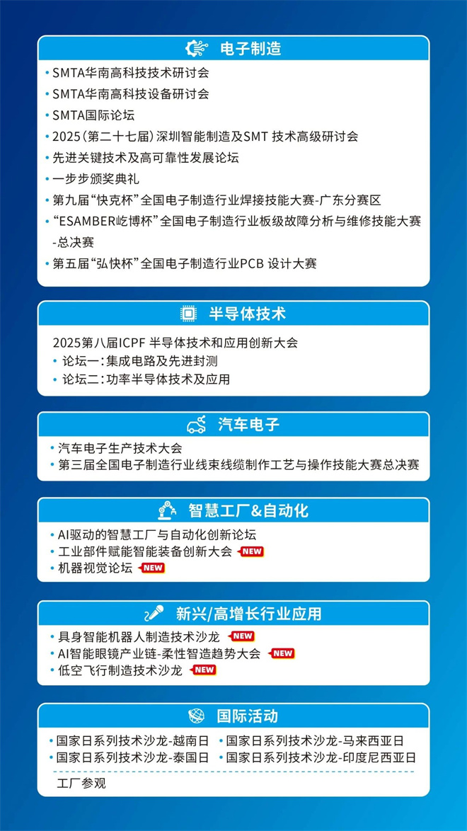 在AI終端、圖像傳感、半導體芯片等關鍵領域持續領跑,成功實現技術創新與多場景應用的深度融合。NEPCON ASIA 2025針對具身智能機器人、低空飛行、智能工廠、機器視覺、半導體、電子制造等領域開展40場會議論壇及賽事活動,深度整合國內外行業協會組織、專家、科研人員、資深從業者、行業應用終端及行業媒體等資源,探討電子制造現狀與未來發展趨勢,實現業務的持續增長,共同拓展市場新未來!