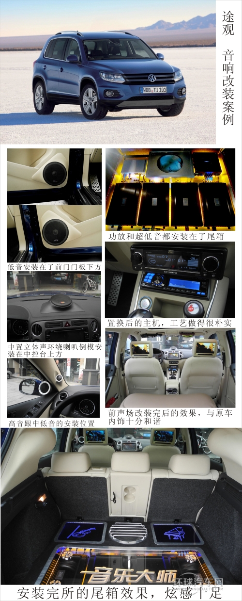 途觀受國人的歡迎無非是被它寬敞的車內空間,內飾豐富等都是它的優點。途觀的內飾延續大眾傳統,給人一種工藝樸實又高檔的感覺。但是豪華的空間里,非常不協調的是原車的音響系統:聲音顯得生硬,中頻過分突出與高音的銜接不好,低頻量雖然較多,但是清晰度和精準度明顯不足,有點拖,使得音場下降,半死不活的樣子。這樣的音樂直接造成人聽覺上的疲勞,煩躁,聽多了都是淚。這樣的音響系統真是浪費掉了途觀寬大的空間。這些音響系統上的缺憾才促成一次次途觀音響改裝的事例。