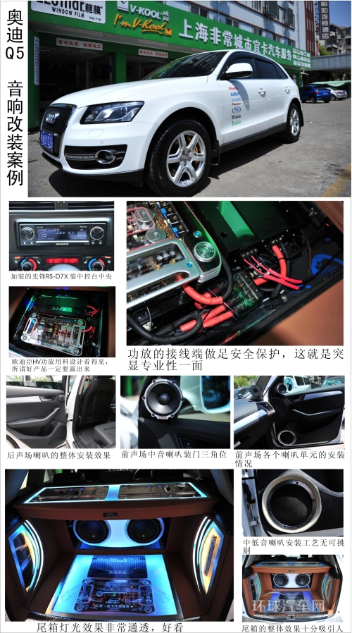 縱觀Q5整個尾箱,左右,內側,或者上下可謂運用到了極致。是的,尾箱是功放,超低音等配件安裝的首選之地。但是,和很多改裝案例不同的是,僅是功放就有5臺,超低音兩只,還有配件這些,在有限空間安裝無不是對技師的一種挑戰。但從尾箱的效果,卻是給人的是多而不亂,安裝十分有條理性的。況且,打開后箱蓋全部器材一目了然,另外燈光的點綴,即使在白天,也能感受到夜間不同顏色燈光效果帶來的效果是那么有“殺傷力”的。