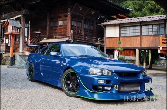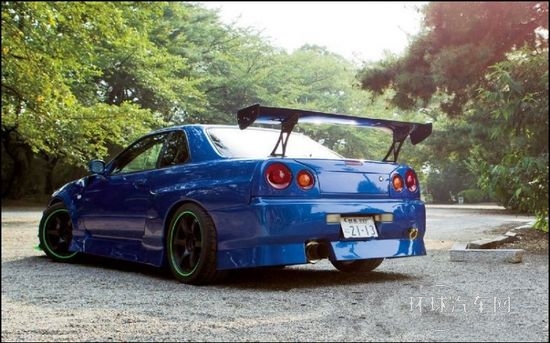 日產Skyline系列的GT-RR34是曾今多少日系車迷心目中不老的戰神,而因為它那臺RB26引擎所具有的強大改裝潛力被改裝發燒友奉為神物。日產SkylineR34尾部加裝巨大的碳纖維GT尾翼,不得不提的是R34那經典的雙圓尾燈。