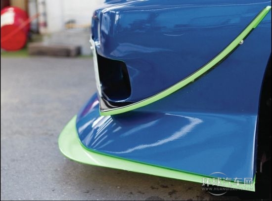外觀上加裝嫩綠色的前唇和風刀,為其高速行駛時理順車前亂流,并且綠色和藍色的顏色搭配非常少見。