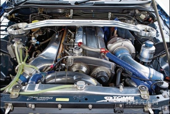 進入引擎艙內部,收現如眼簾的的是這臺爆改的引擎,日本引擎強化專家TOMEI對引擎進行全面升級,加裝大號渦輪更換進氣、噴油及制冷裝置,對引擎艙加裝拉桿進行強化。