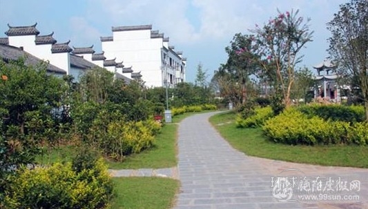 進(jìn)入園內(nèi),確有不識(shí)此園真面目,只緣身在此園中的感受。山中有園,園外是山,說(shuō)是五百余畝雖不可信,說(shuō)是千畝開(kāi)外也不可知。只見(jiàn)白墻紅瓦的徽派建筑映掩在綠樹(shù)叢中,以寬闊高朗的接待大廳為中軸線,形成系列瀏覽區(qū):可供游客休閑度假的徽派仿古豪華別墅群、可供文人墨客激情揮毫的場(chǎng)所九華書(shū)舍、充滿傳奇色彩的佛教文化院高庵古寺、搬遷落戶的明清時(shí)期古村落、休閑觀光垂釣園,從北至南,依次排列,布局合理,錯(cuò)落有致。