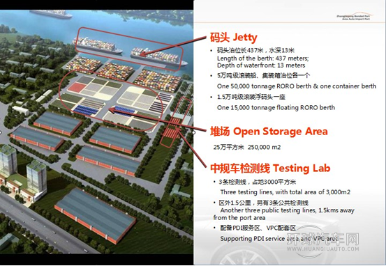 張家港保稅港區汽車整車進口口岸作為長江流域以及江蘇省唯一的汽車整車進口口岸,基礎設施配套齊全,擁有5萬噸級滾裝船泊位、集裝箱泊位各1個、1.5萬噸級滾浮碼頭1個;碼頭陸域擁有55萬平米堆場,滿足年進口20萬輛、出口30萬輛的周轉停放需求;建有進口汽車法定檢測線、非中規車檢驗實驗室和進口汽車上牌窗口,配備PDI服務區、VPC配套區,為客戶提供“到港車輛,不分批次大小,二天內完成檢測,一天內完成出證”的服務承諾。