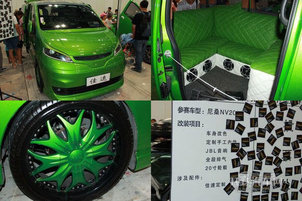 一提到商旅車,出現在腦海里的大都是像埃爾法、唯雅諾這樣三五十萬的車型,要想再10萬元上下找出一輛車型幾乎不可能。在本屆車展上就有這樣一款起步價很便宜的NV200改裝的商旅車,翠綠的車身在大街上的回頭率一定超過100%。內飾的改動則更加愜意,車主拆掉了原來的兩排座椅,用一圈同樣翠綠的軟包“沙發”取而代之,要不是攔著,我一定會上去體會體會。