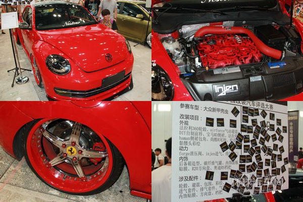 眼前這輛紅色甲殼蟲可以說是本屆車展上的最萌車型,全車整合法拉利、寶馬、奧迪等眾多知名車型的配件。不要被它停在那里的萌態所欺騙了,跑起來對于市面上大部分以性能車自居的家伙們,能看見它的尾燈就算你贏。