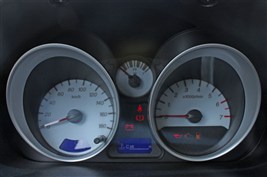 樂馳運動版車型采用了深色內飾風格,看上去確實非常不錯,鍍鉻裝飾的出風口,桶形儀表盤配合藍色紅色的背光以及雙色座椅都讓車主能提起一些運動的感覺,雙色座椅和奧拓一樣酷酷的。