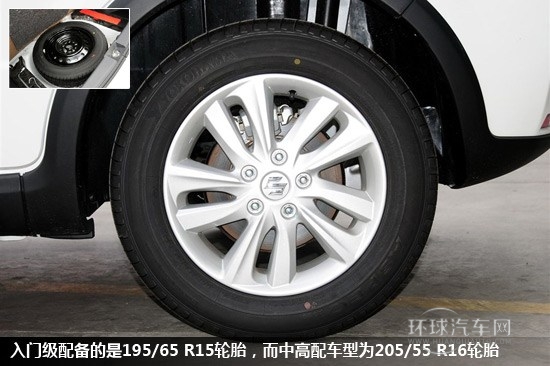 SX4酷銳款采用的是和老款一樣的輪胎配置,低配車型配備的是195/65 R15輪胎,而靈動型以上配備的是205/55 R16優科豪馬輪胎,是一款舒適性為取向的輪胎。比較值得一提的是采用了全尺寸備胎,這在同級別中較為少見。