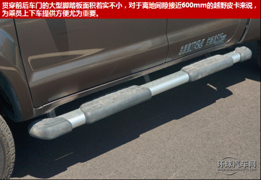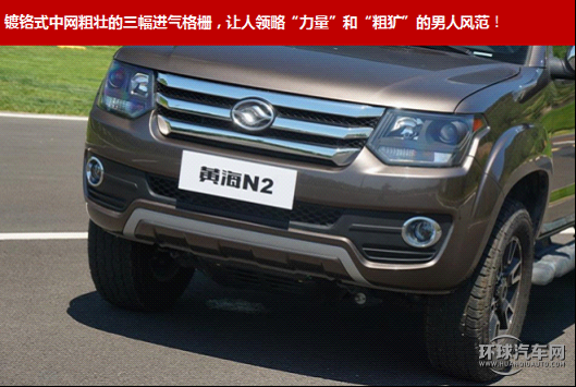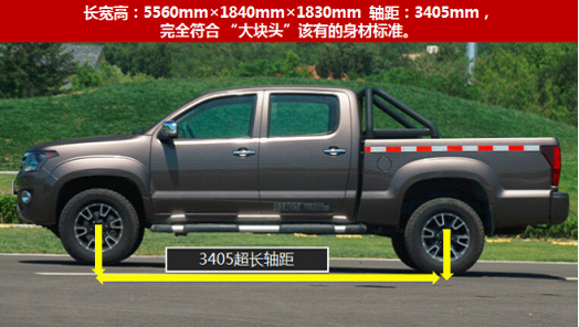黃海N2的給人的第一印象,絕對可以用霸氣十足來形容。整車5560mm×1840mm×1830mm的長寬高尺寸以及3405mm的超長軸距,完全符合全尺寸皮卡應有的“身材”,黃海N2采用了加長抬高的車身設計,站在它面前,總會令人產生一種敬畏的感覺。