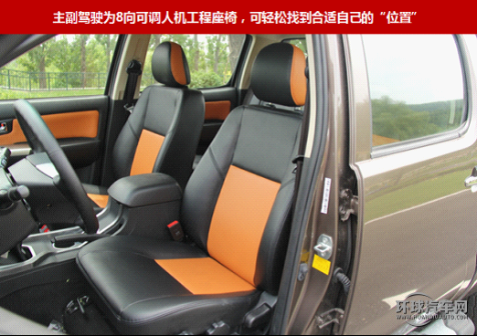 進入黃海N2駕駛室,首先吸引你的便是雙色搭配的皮革座椅,橙色的加入使得整車內飾氛圍頓時活潑起來,色調鮮明的配色凸顯時尚與動感,主副駕駛席為8方向可調,任何身材的駕駛者都可以輕松找到適合自己的坐姿。