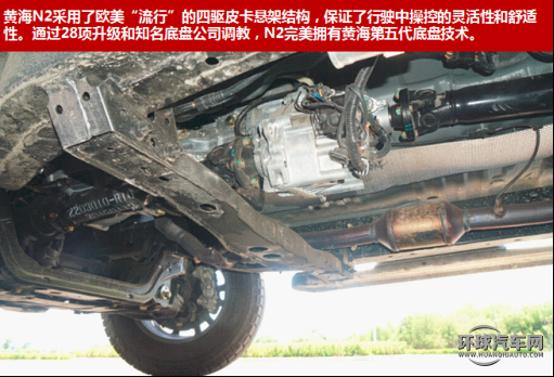 黃海N2采用了歐美“流行”的四驅皮卡懸架結構,前懸架為先進的四驅雙叉臂,將螺旋簧與雙叉臂懸架完美匹配,保證車輛前輪部分的大量空間來布置驅動橋部分,同時保證了行駛中的操控靈活和舒適性,操穩表現極佳。通過本特勒公司對底盤進行的性能開發、NVH優化以及綜合調校,N2完美擁有了黃海第五代底盤技術,在國內皮卡制造領域堪稱一流。