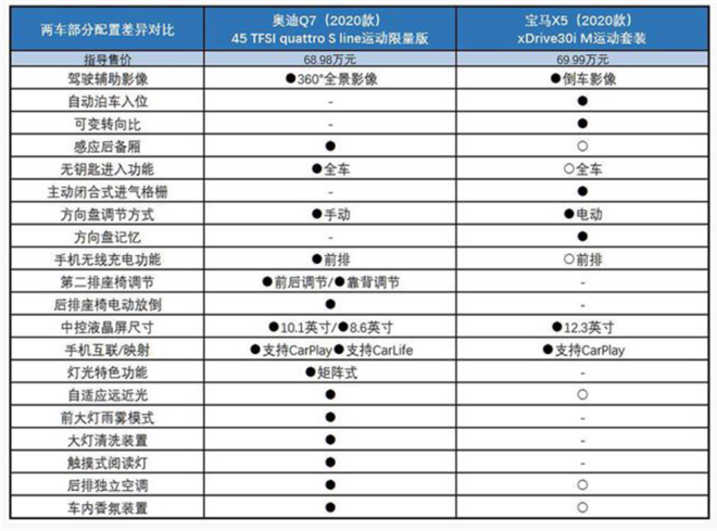 不管是手持十萬還是百萬,除了沖著品牌、口碑之外,配置也是選擇的關鍵要素。畢竟“排面兒”替代不了“好開”的高效與便捷。新寶馬X5售價區間為69.99-84.99萬元,而全新奧迪Q7售價區間為68.98-86.68萬元,下面先以兩款車的入門款車型為例作對比,一探究竟。