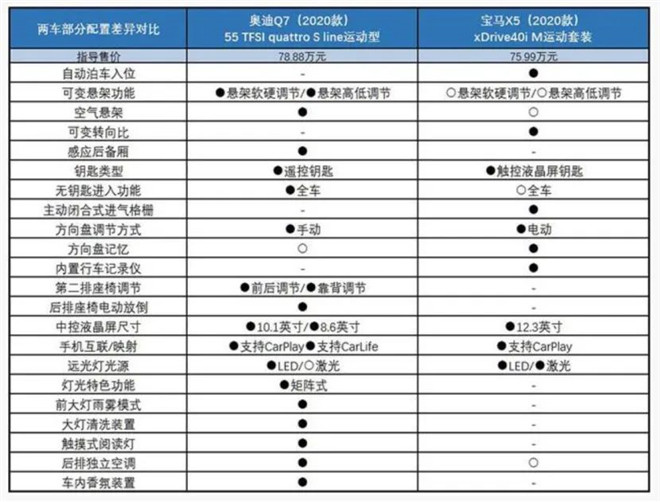 有人說,既然我都手持百萬了,入門款不考慮!行,那給大家對比中配檔。以78.88萬的全新奧迪Q7 55 TFSI Quattro S line運動型和75.99萬元的新寶馬X5 xDrive40i運動套裝為例,全新奧迪Q7的優勢在于采用了空氣懸架并且可以調節懸架軟硬和高低、矩陣式燈光特色功能、前大燈雨霧模式、大燈清洗裝置、觸摸式閱讀燈、后排獨立空調、車內香氛裝置等。