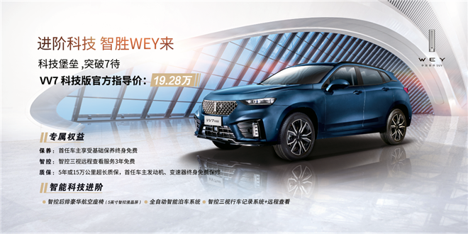 對年輕精英群體來說,汽車既是智能出行的重要載體,也是承載科技生活的智能平臺。WEY VV7瞄準后浪精英群體,為滿足他們的高品質用車需求而來。8月20日, VV7科技版正式上市,售價19.28萬元。新車上市之際,WEY品牌推出多重優惠政策,如購車即享基礎保養終生免費、智控三視遠程查看服務3年免費、雙超質保三重專屬禮遇。